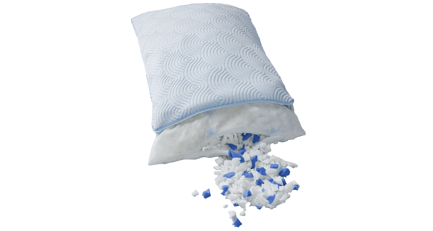 image of the TEMPUR-Cloud Adjustable pillow showing the inside fill with a blue badge saying "Tempur material inside"